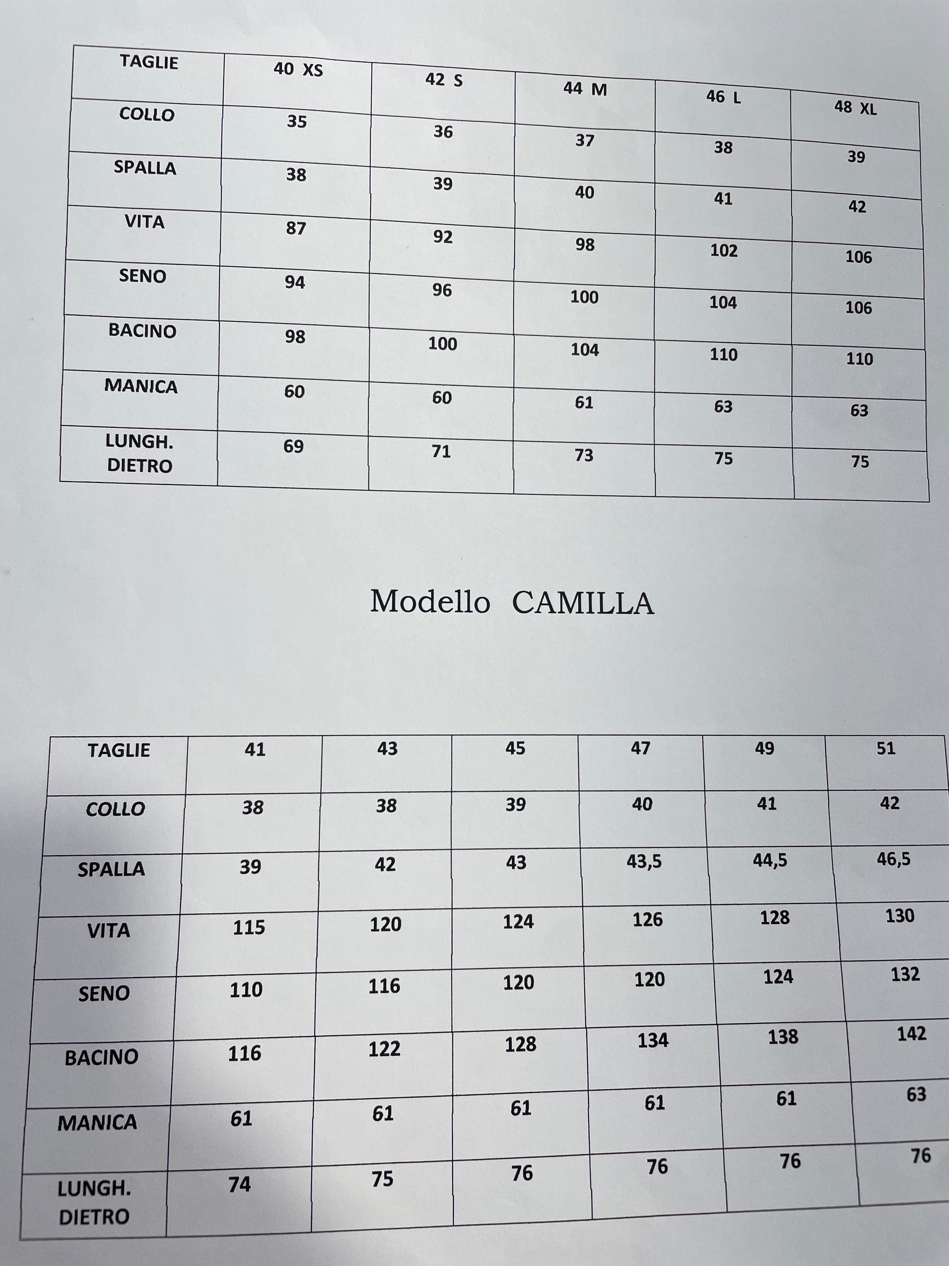 tabella taglie e misure alla fine delle foto e del video